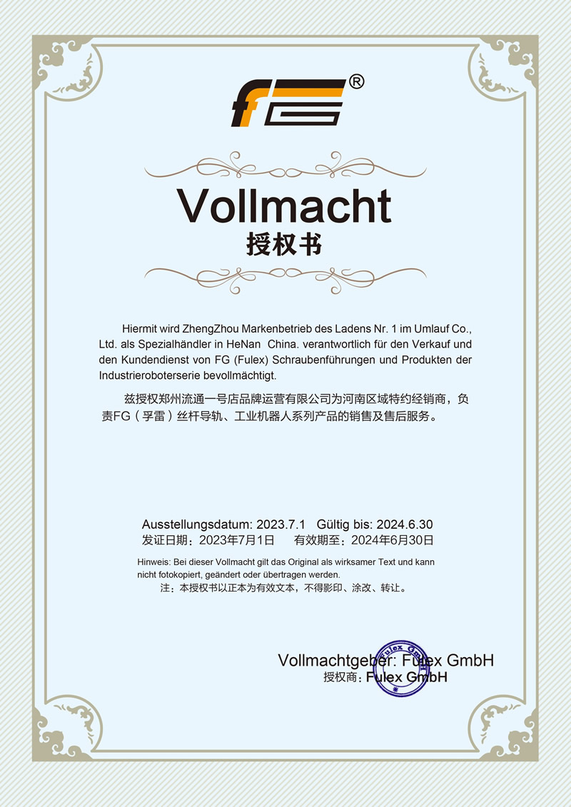 鄭州流通一號(hào)店品牌運(yùn)營有限公司引進(jìn)德國進(jìn)口品牌Fulex GmbH簡稱FG(孚雷),主要負(fù)責(zé)河南區(qū)域的FG(孚雷)絲桿導(dǎo)軌、工業(yè)機(jī)器人系列產(chǎn)品的品牌推廣、市場開發(fā)及售后服務(wù)。
